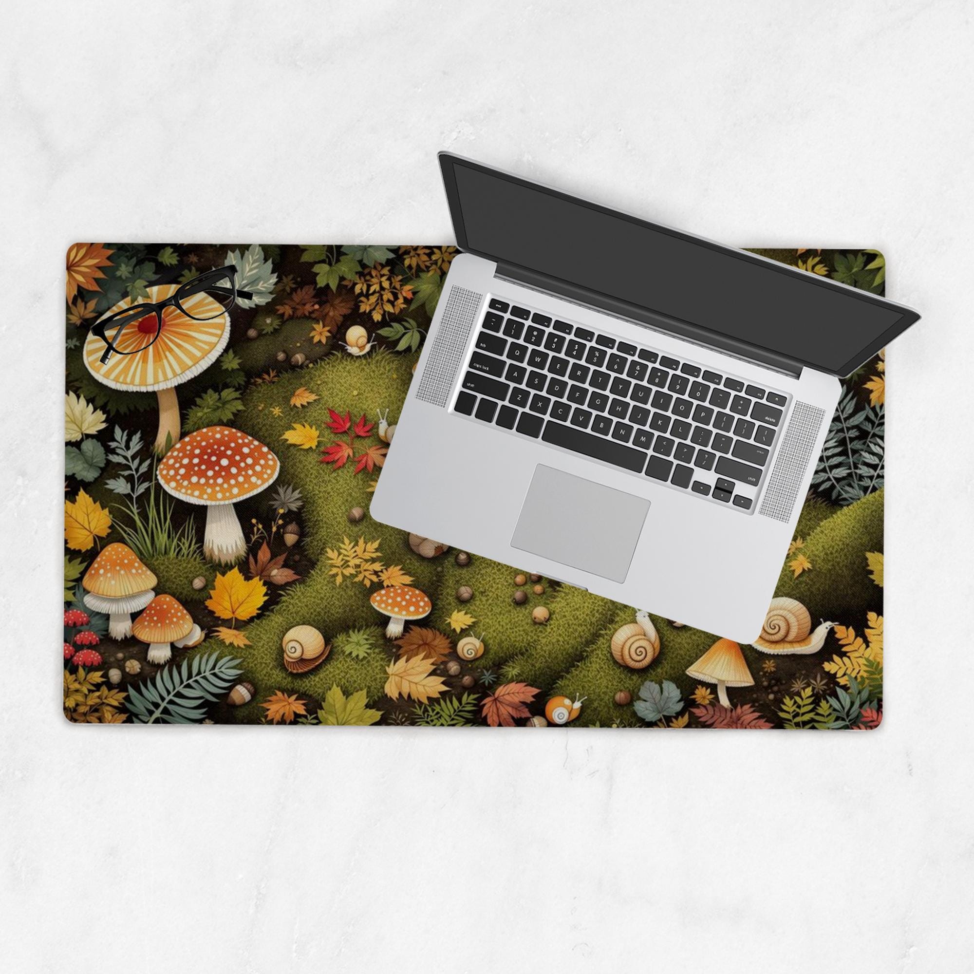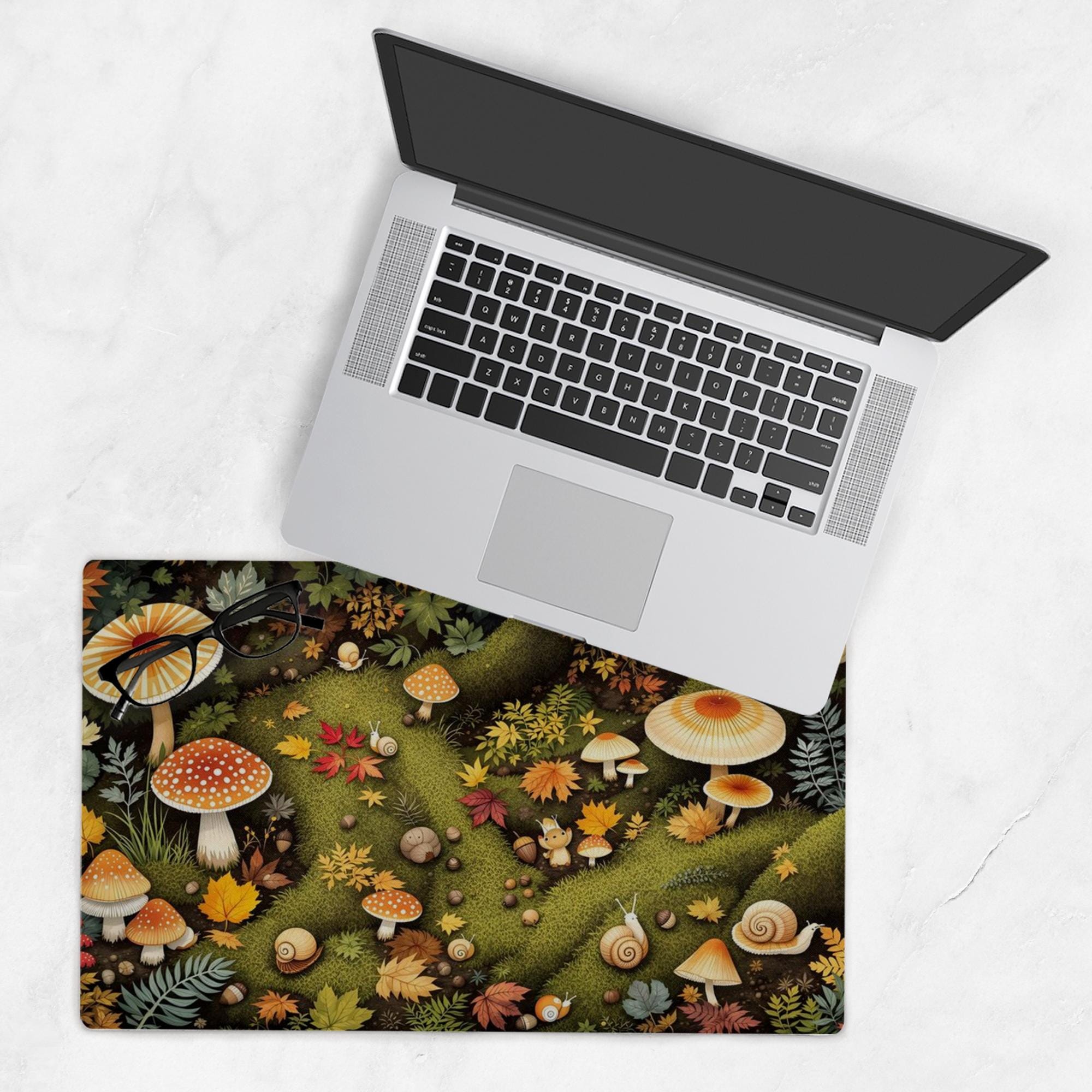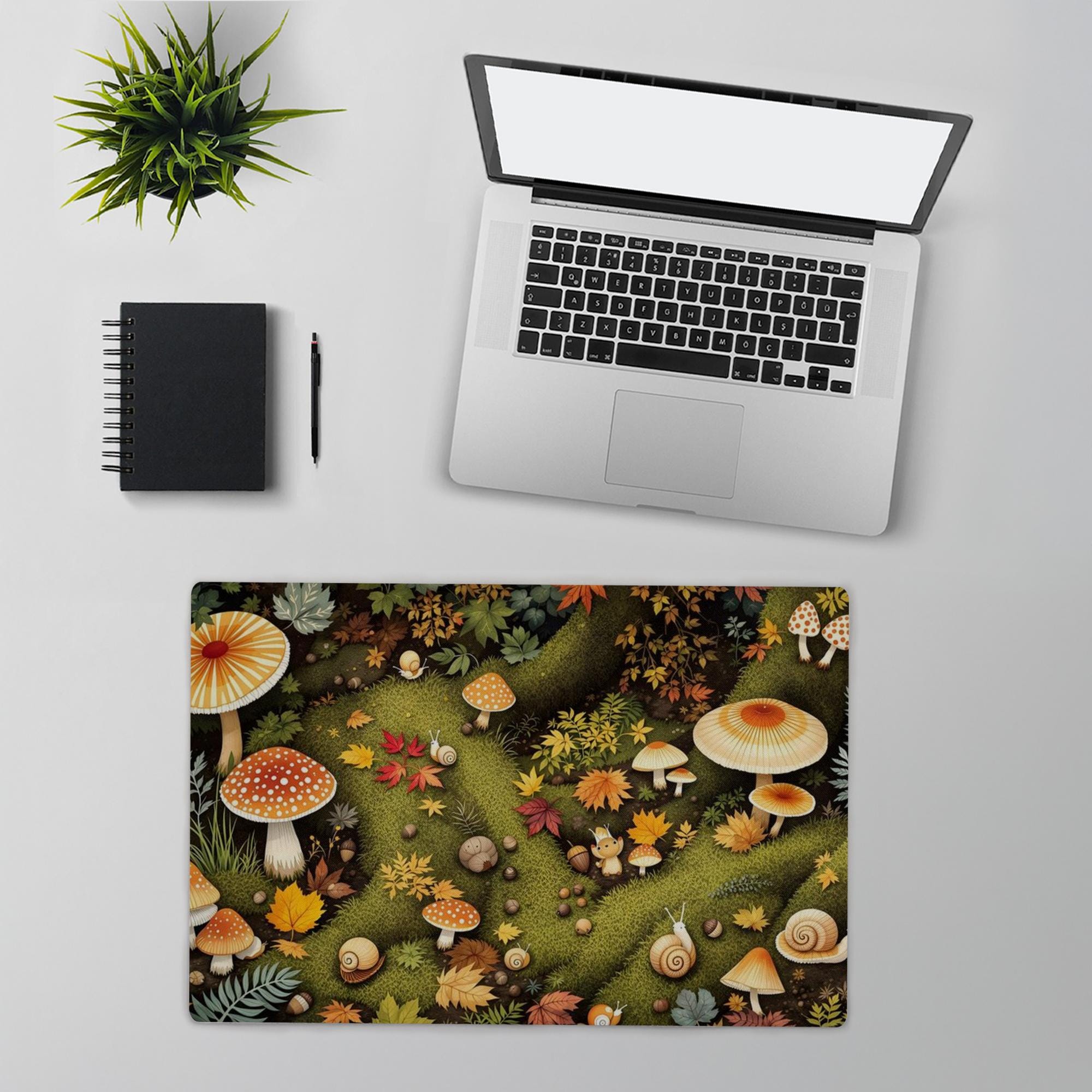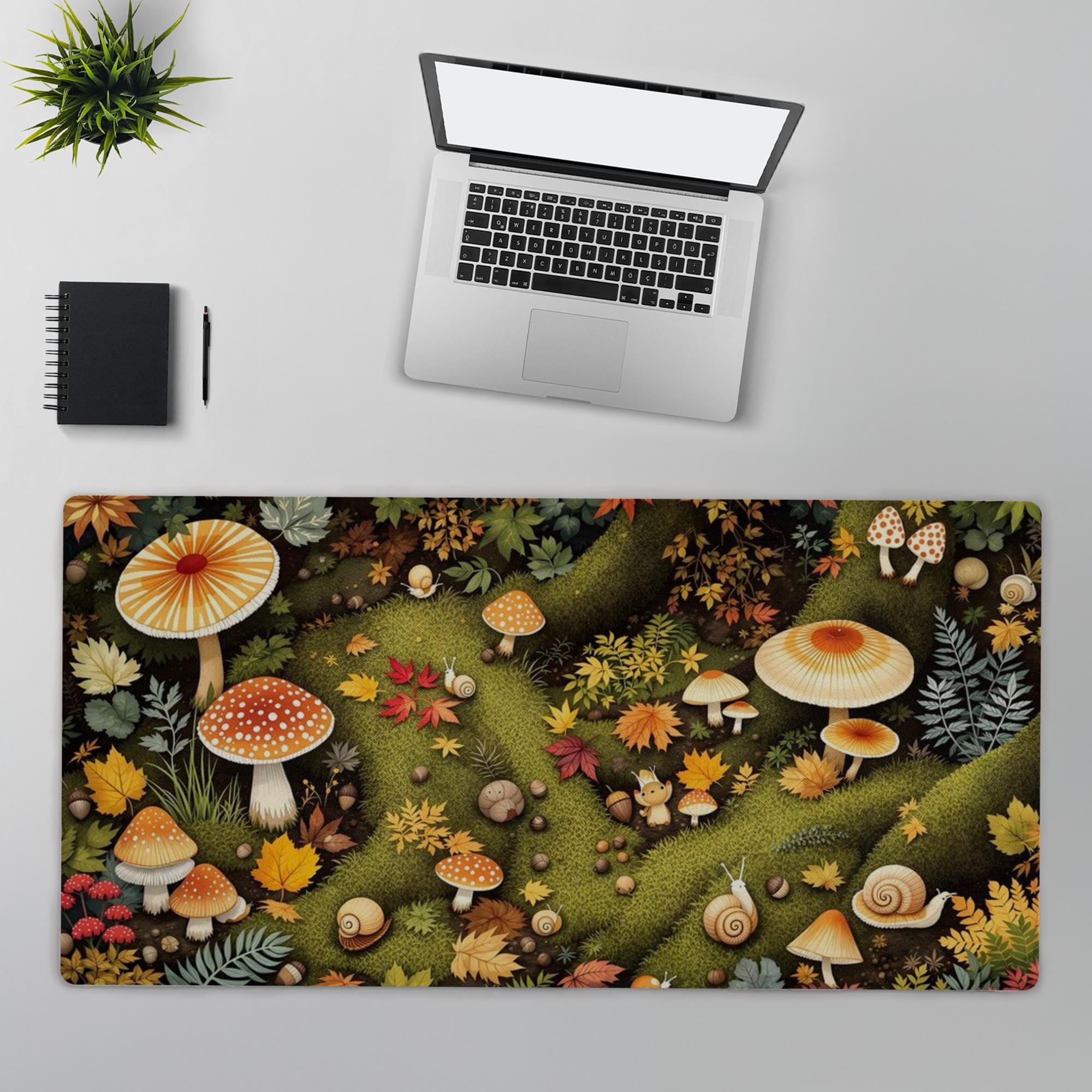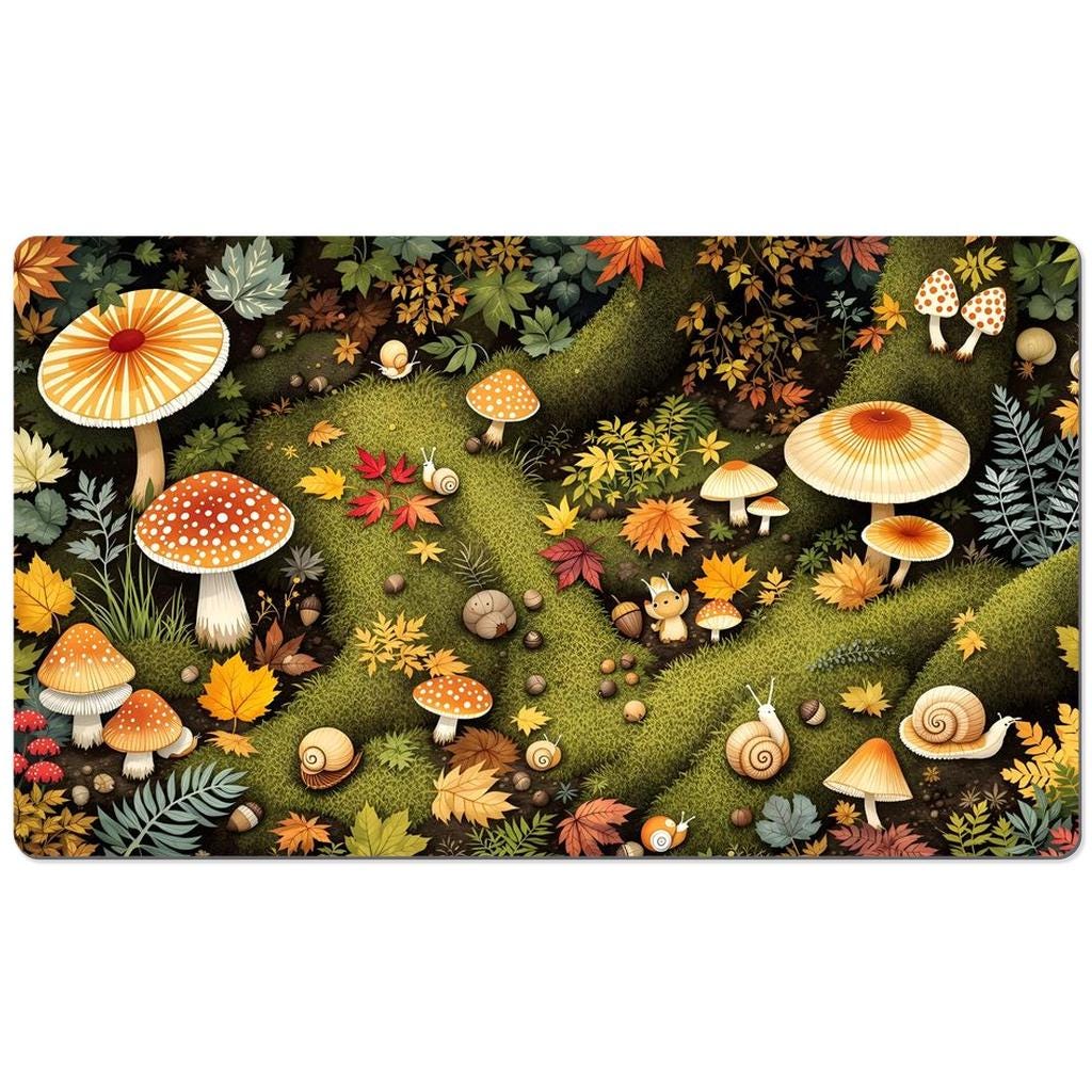 Step into a storybook forest with this richly detailed **Whimsical Mushroom Forest Desk Mat.** Illustrated in a style reminiscent of Beatrix Potter, this top-down woodland scene captures the magic of nature with vibrant mushrooms, scattered acorns, curious snails, and mossy textures. Earthy tones and delicate linework create a cozy, enchanted atmosphere perfect for artists, nature lovers, and cottagecore daydreamers alike.