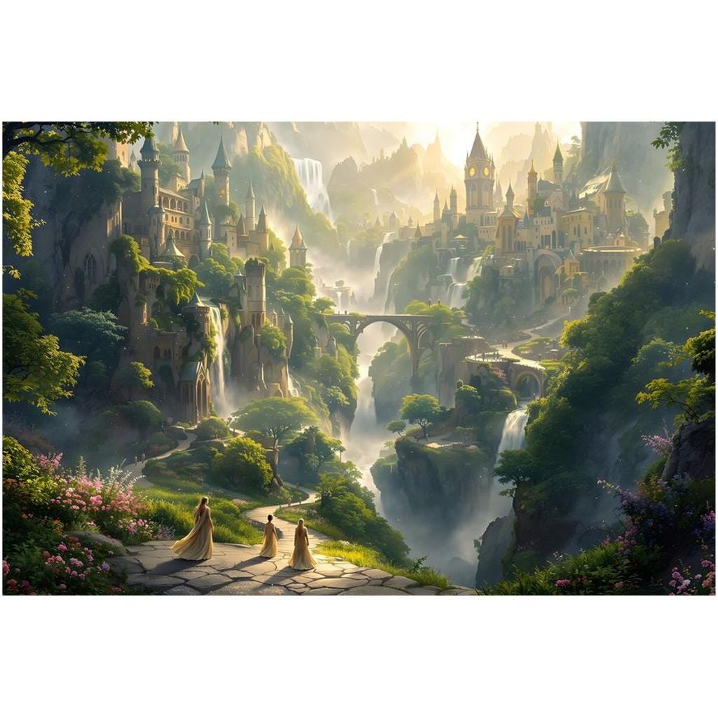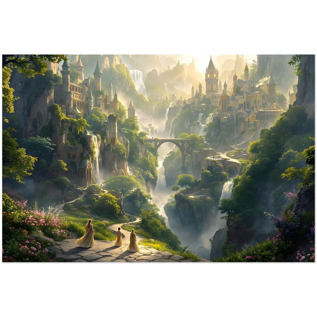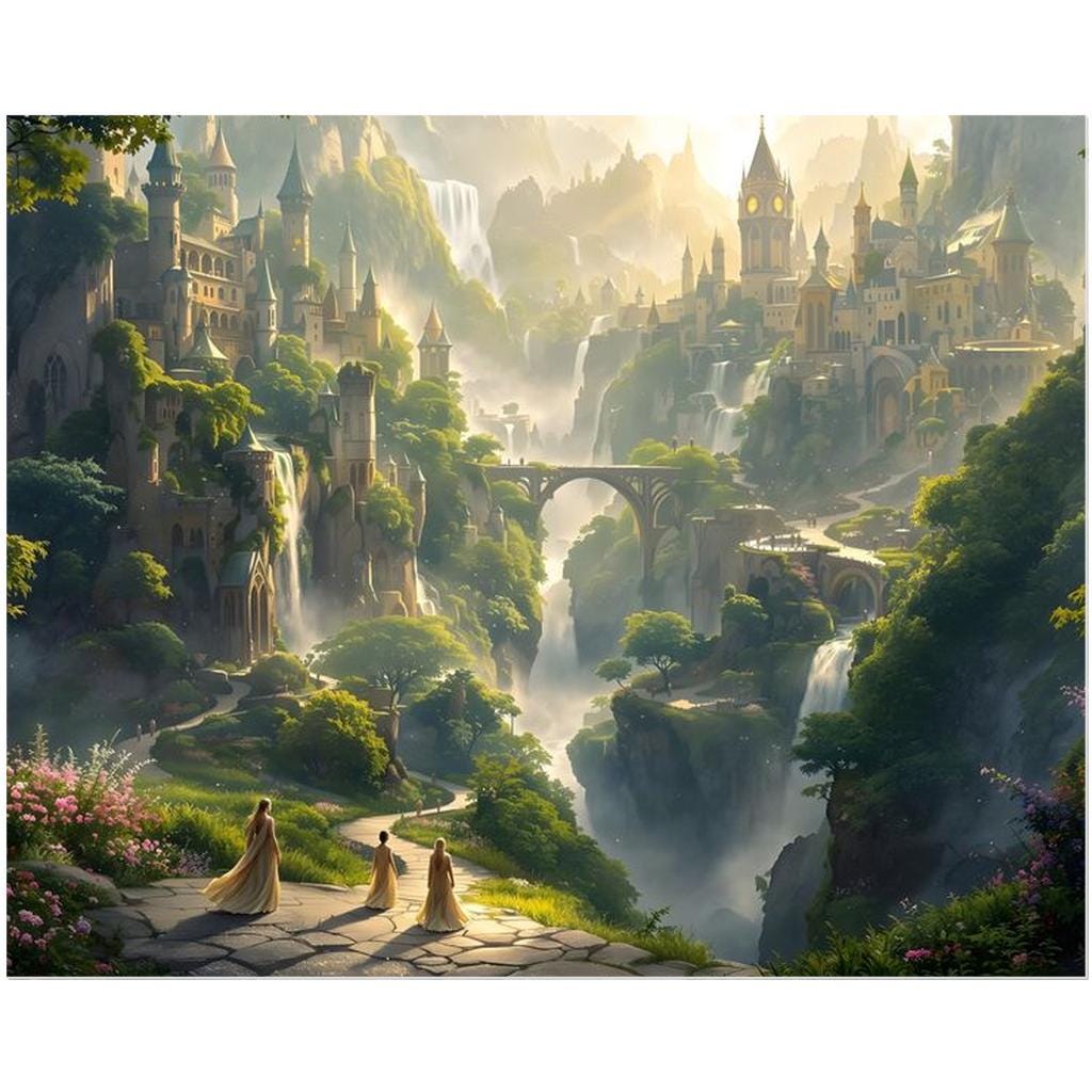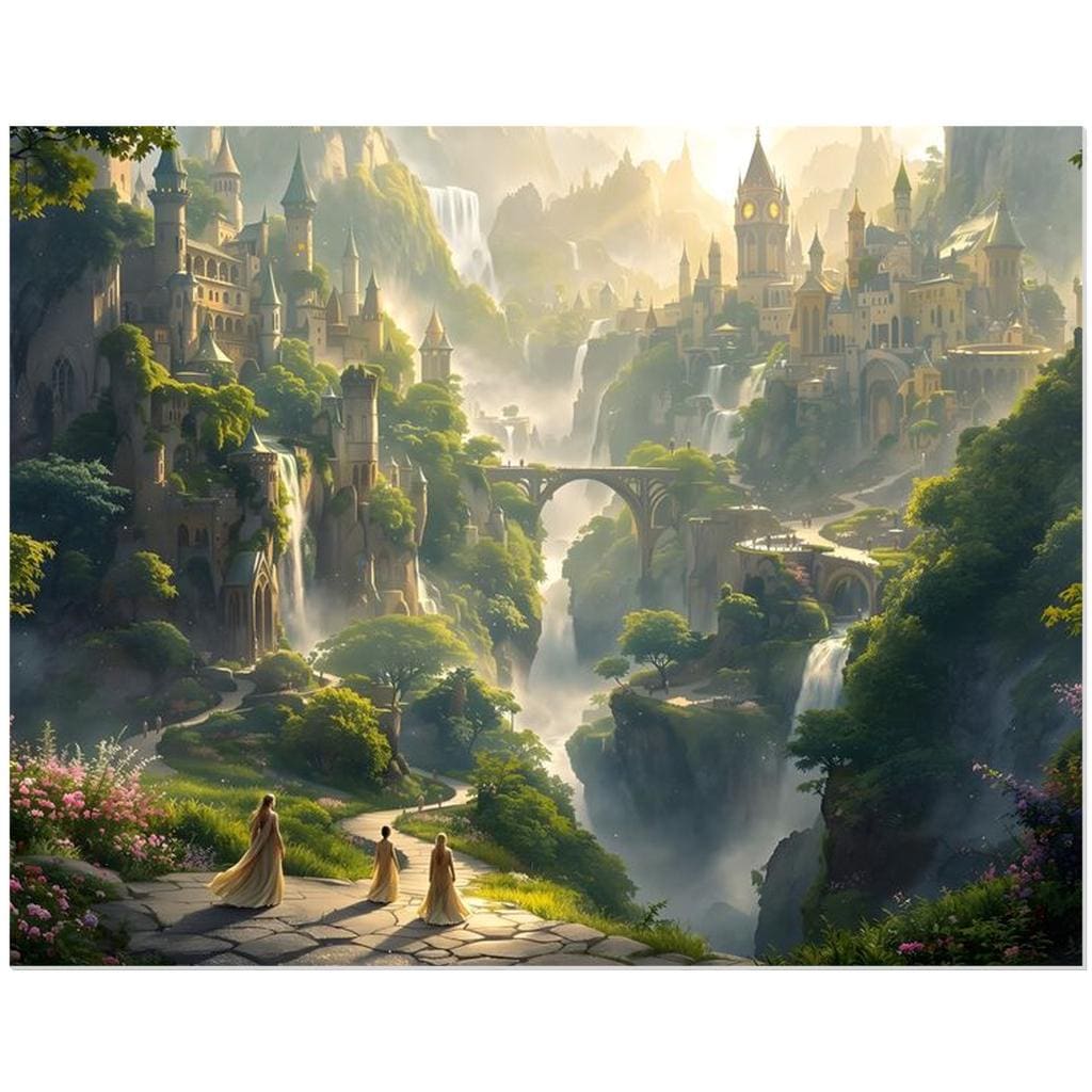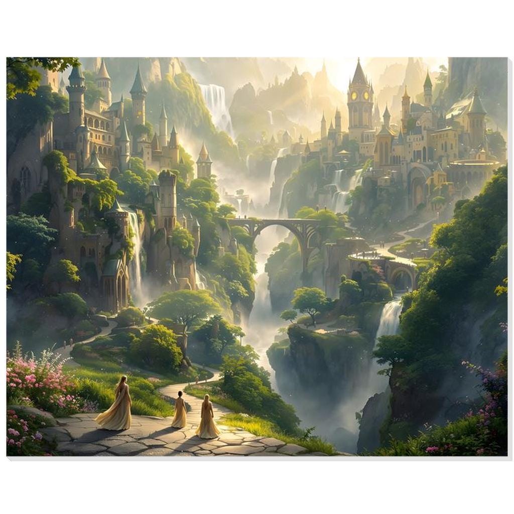 Bring the serenity and wonder of a mythical elven kingdom into your space with this breathtaking acrylic wall art. Featuring an intricate fantasy city nestled among cascading waterfalls and lush greenery, this high-definition digital matte painting captures the essence of a peaceful realm hidden in the mountains. Golden sunlight pours over towers, arched bridges, and forest paths, with robed figures wandering a world that feels both ancient and timeless.