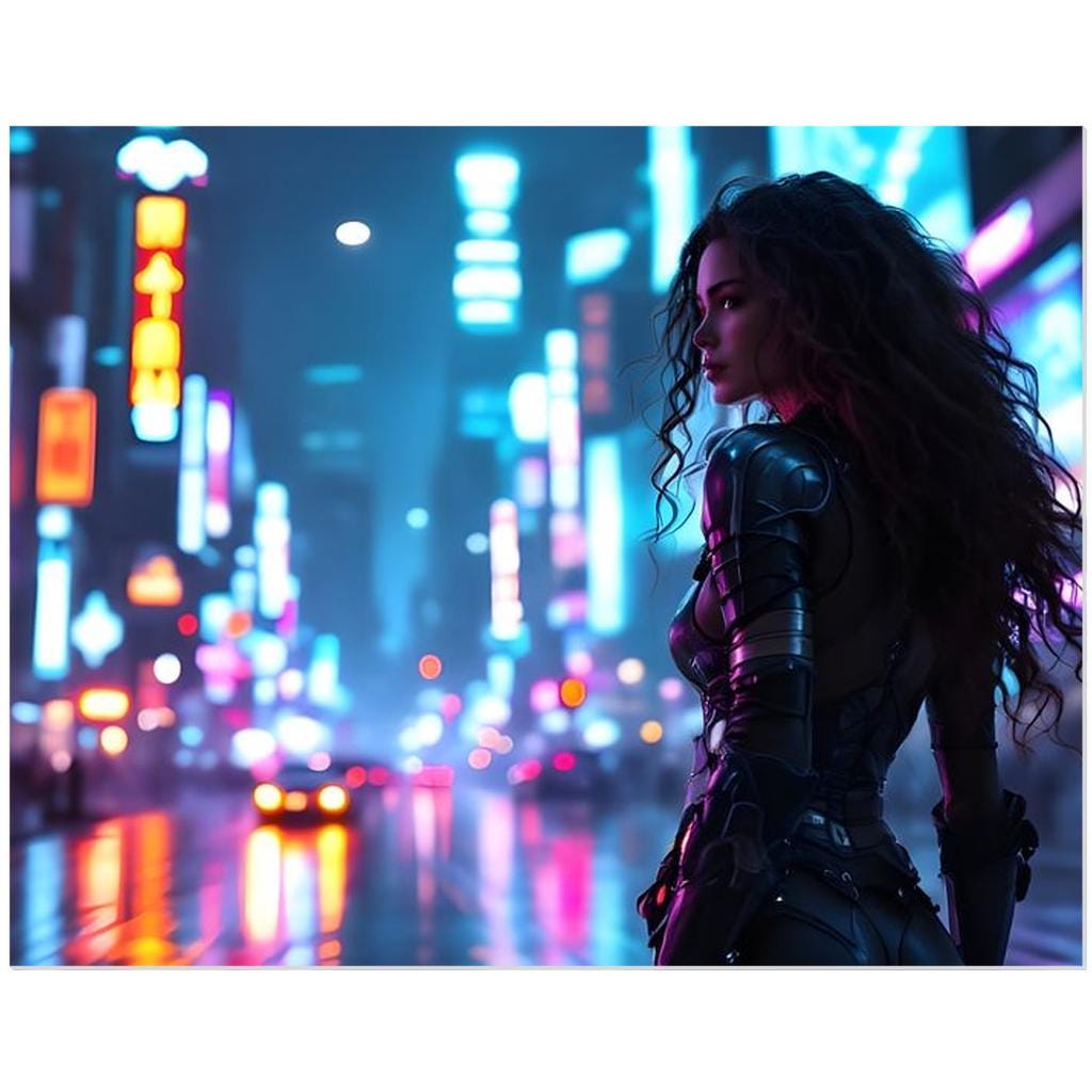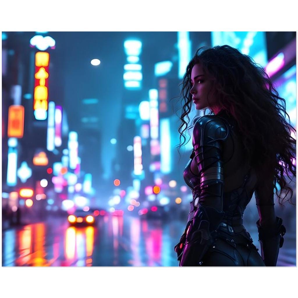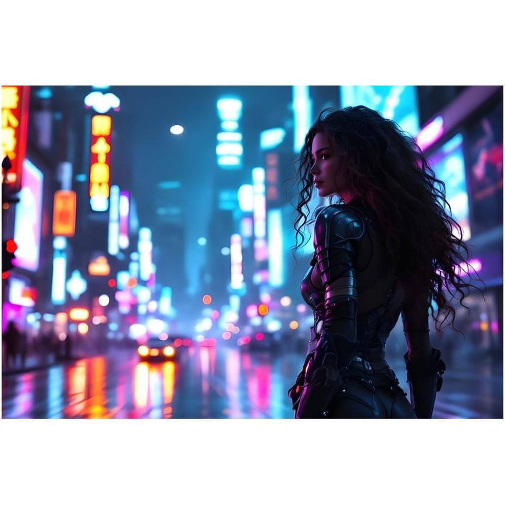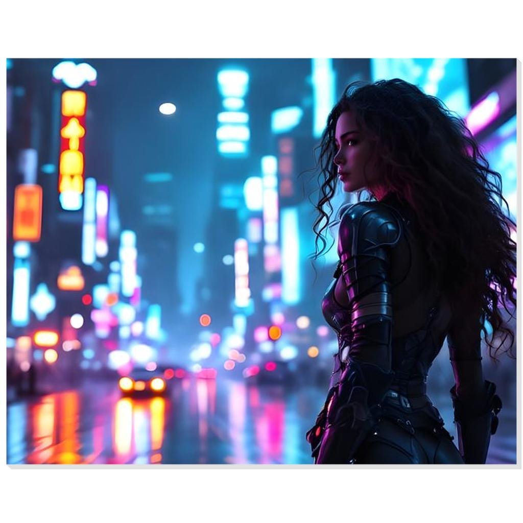 Description: Immerse yourself in the vibrant pulse of a futuristic city with this striking acrylic print featuring a cyberpunk woman standing amidst glowing neon signs and rain-slicked streets. Her armored suit gleams under the city lights, exuding strength and mystery. This cinematic cityscape blends science fiction aesthetics with modern flair, making it a bold statement piece for fans of dystopian worlds and neon noir settings. Perfect for modern interiors, gamer spaces, and cyberpunk-themed rooms.