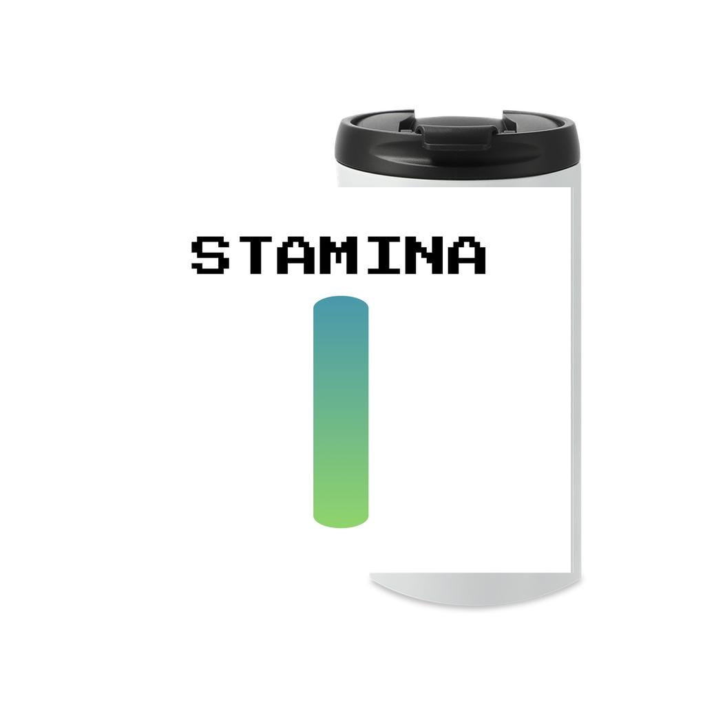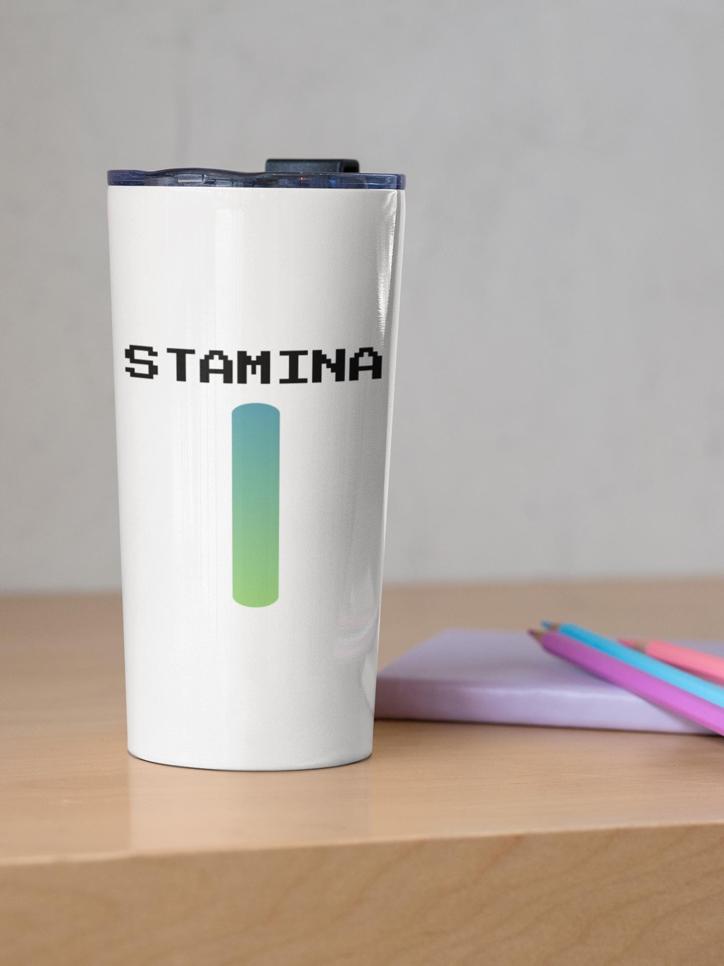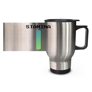 Take your power bar on the road with this Stamina Stainless Steel Travel Mug inspired by classic RPG energy meters. Designed for commuters, gamers, and early risers, this bold wraparound artwork keeps your focus sharp whether you are heading to work or logging into your next quest. The durable metal body and secure press-in lid make it perfect for busy mornings, road trips, and long gaming sessions. A practical drinkware upgrade with a subtle fantasy-inspired edge.